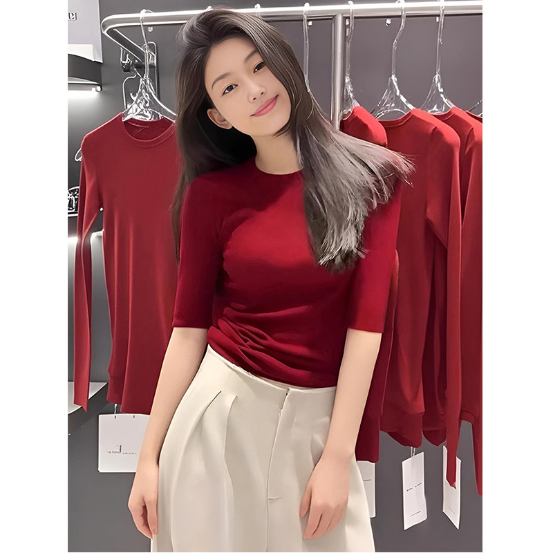 打底衫女春夏修身红色圆领针织衫洋气2025新款休闲修瘦五分袖上衣