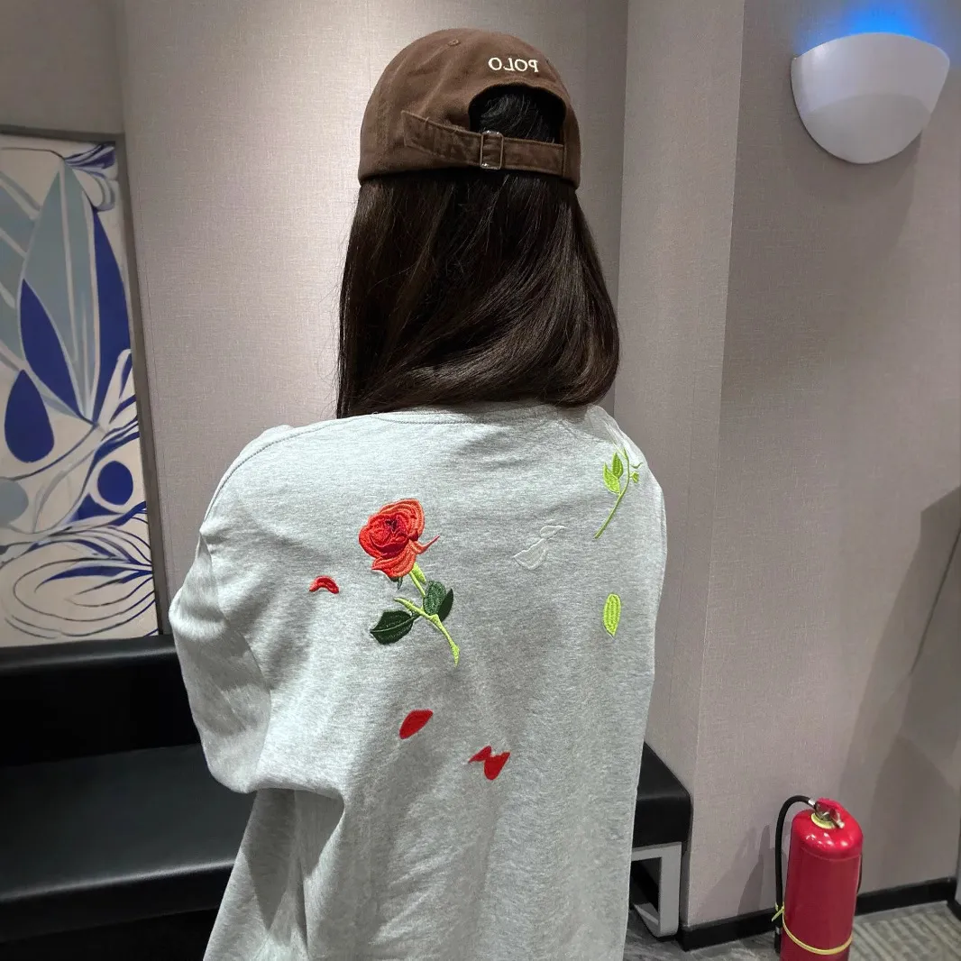 国潮牌玫瑰刺绣花卉短袖t恤女夏季宽松设计感小众慵懒风半袖上衣