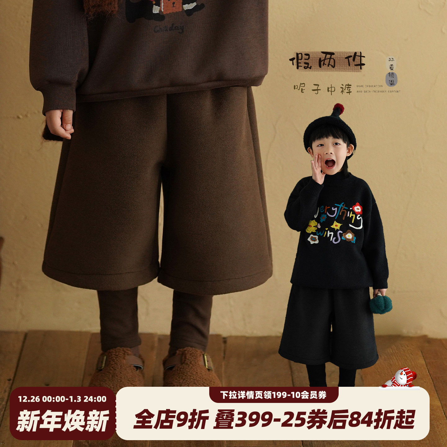 砚台家男童假两件呢子中裤2025冬季新款洋气中小童童装儿童休闲裤