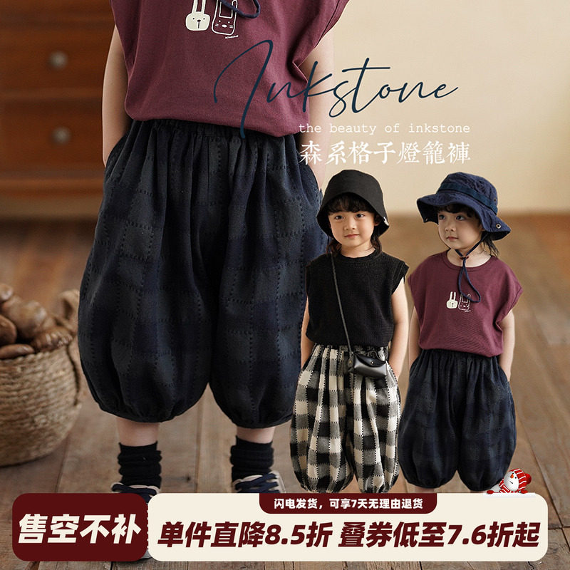砚台家韩版儿童棉麻格子裤男童中裤男孩八九分灯笼裤2025夏季新款