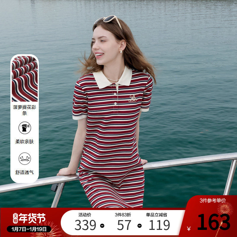 betu百图学院风红白条纹连衣裙女2025年夏季新款短袖polo连身裙