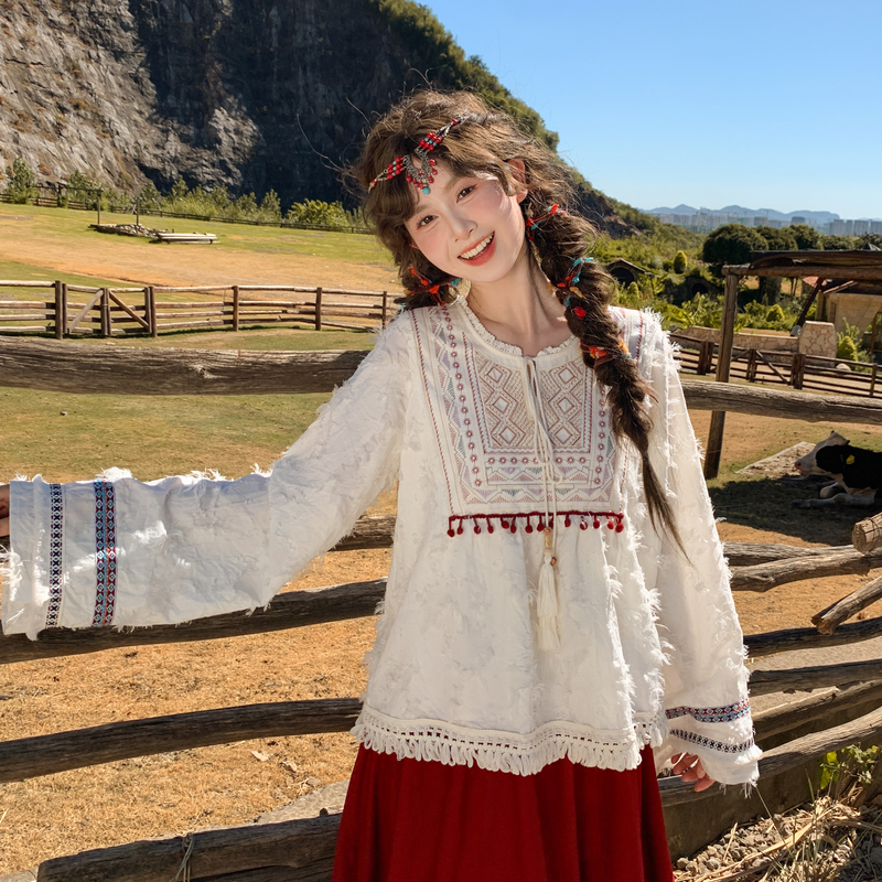 森女部落民族风流苏设计感刺绣圆领衬衫女2025新款秋百搭宽松上衣