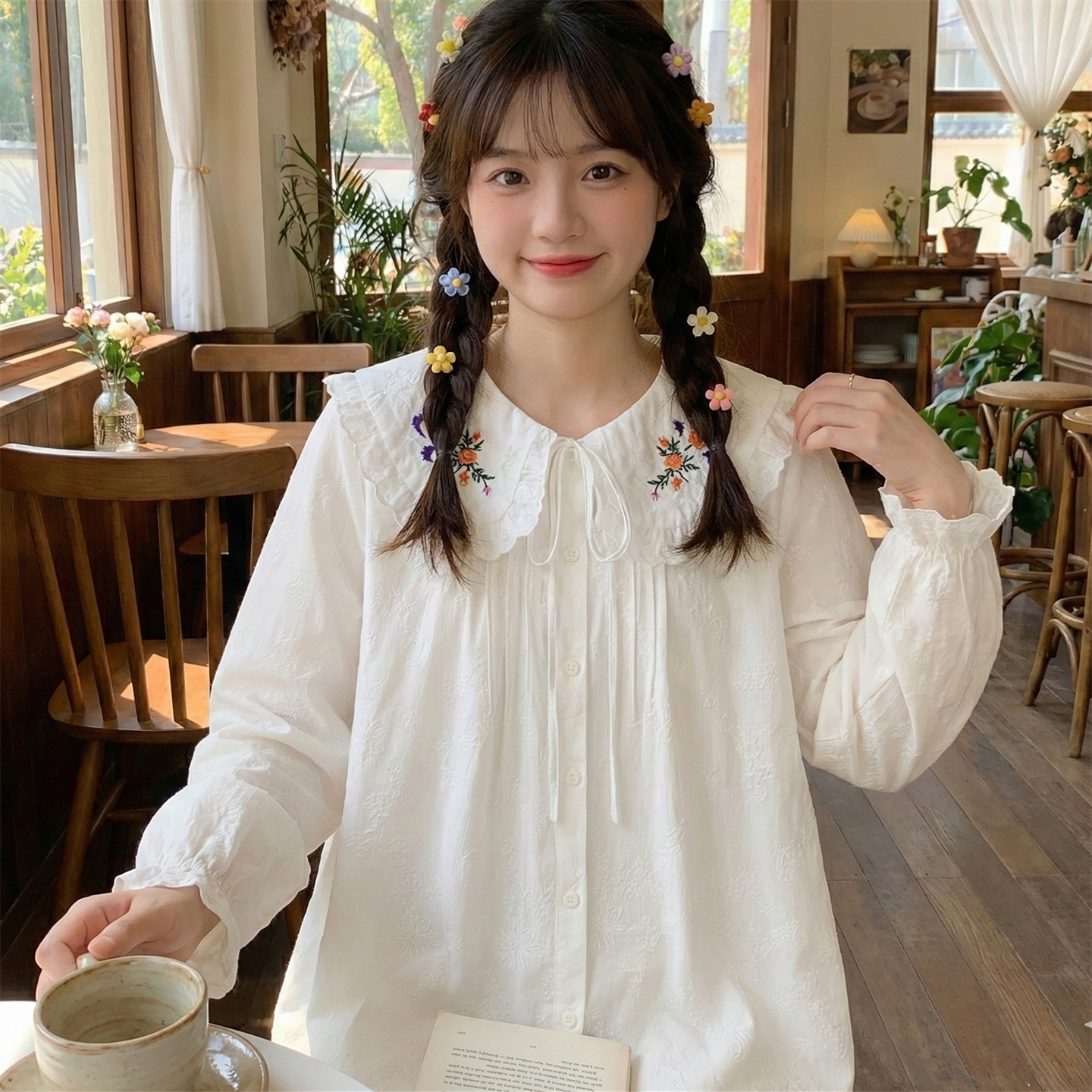 - 刺绣泡泡袖衬衫女