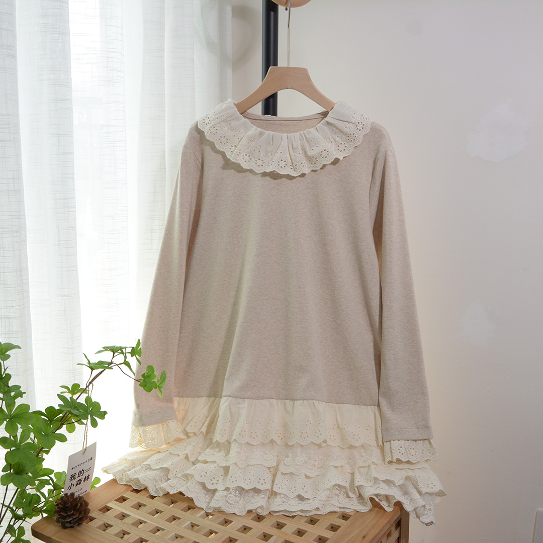 24春森女系刺绣镂空花边领棉质四层花边叠穿打底衣甜美中长T恤衫