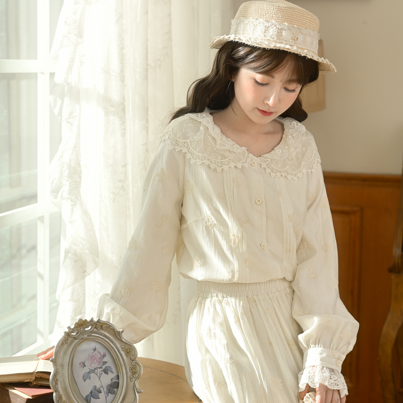 森系温柔蕾丝娃娃领长袖衬衫精致花朵刺绣内搭叠穿打底衫甜美上衣