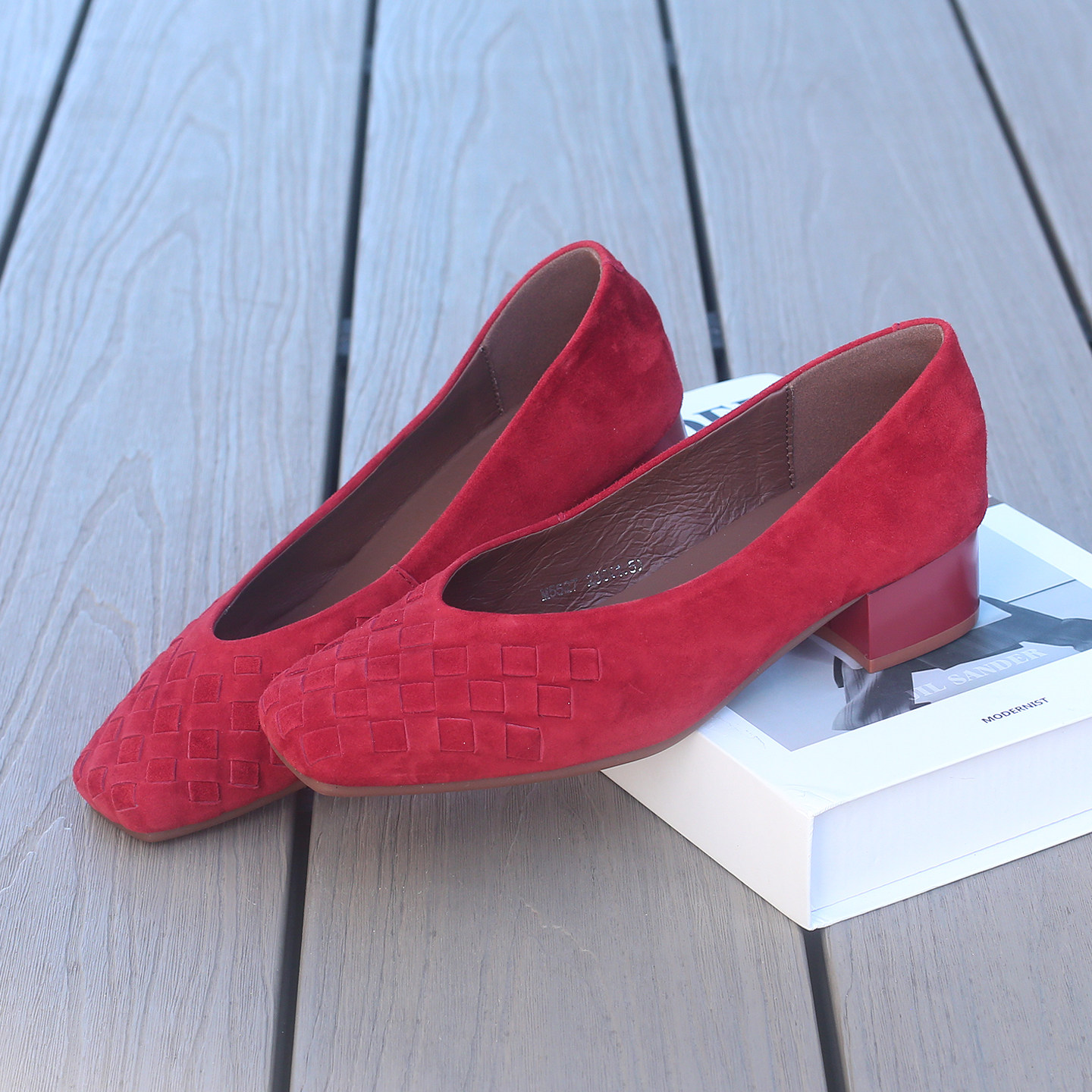 法式编织气质粗跟鞋软皮软底红色浅口方头单鞋2025秋新款磨砂羊皮