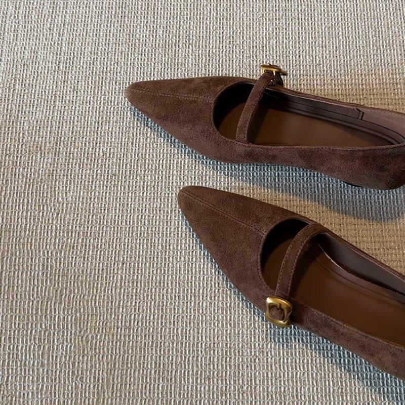 软皮复古棕色简约粗跟单鞋女2026一字带磨砂皮尖头浅口软底工作鞋
