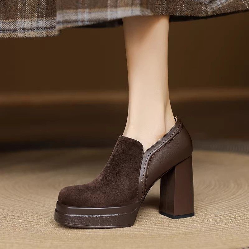 粗跟防水台磨砂羊皮单鞋女厚底超高跟通勤春秋圆头真皮新款工装鞋