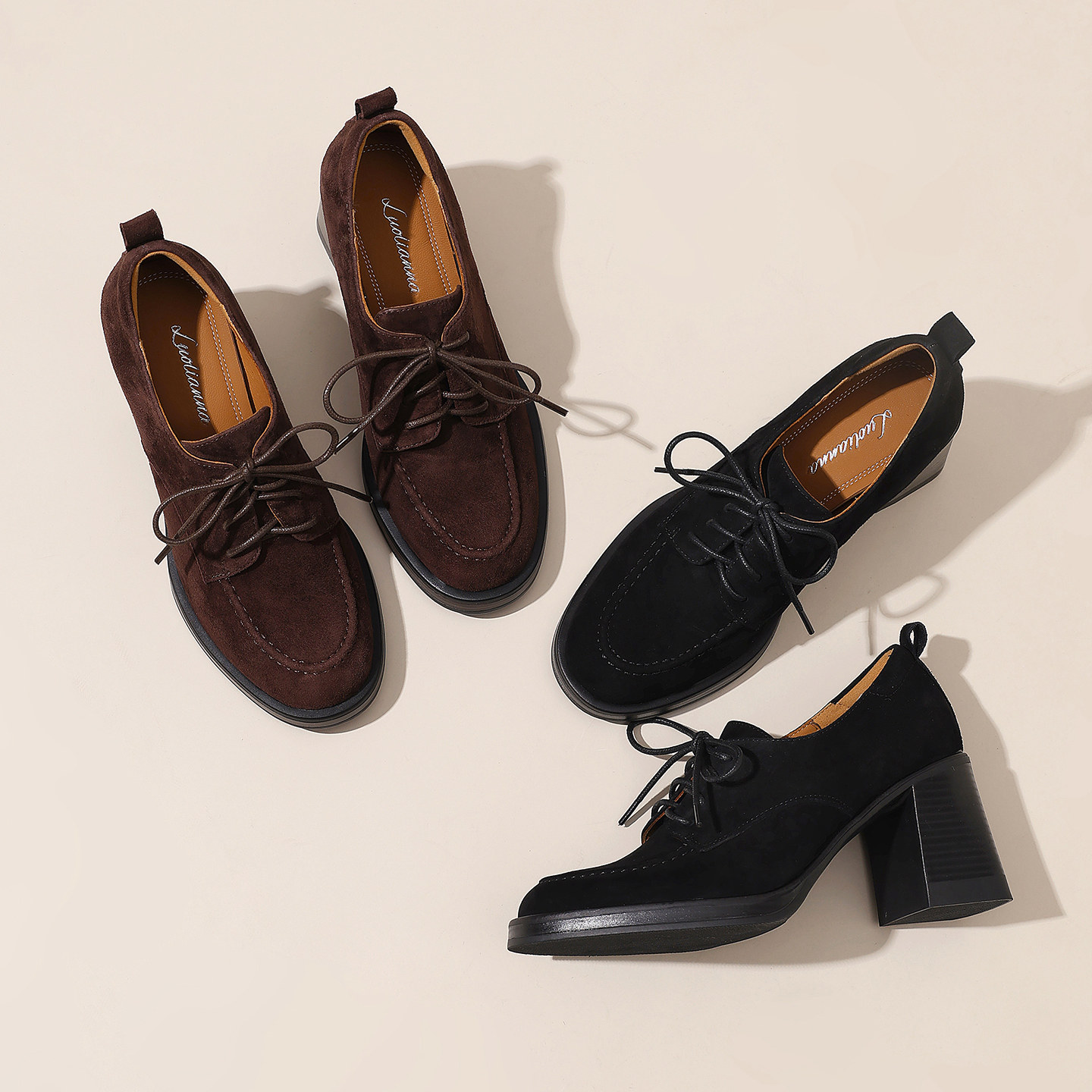 洋气复古时尚小皮鞋磨砂皮系带圆头粗跟真皮乐福鞋高跟深口单鞋女