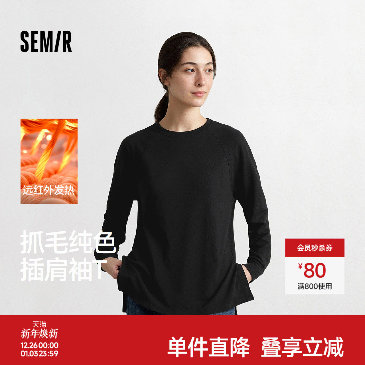 森马长袖T恤女中长款宽松发热纯色插肩袖2025冬新款抓毛开叉上衣