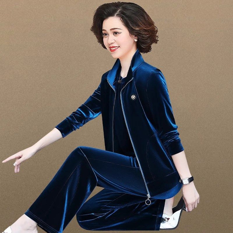 速发妈妈春装金丝绒运动服套装洋气阔太太中套年春人秋外老时尚上