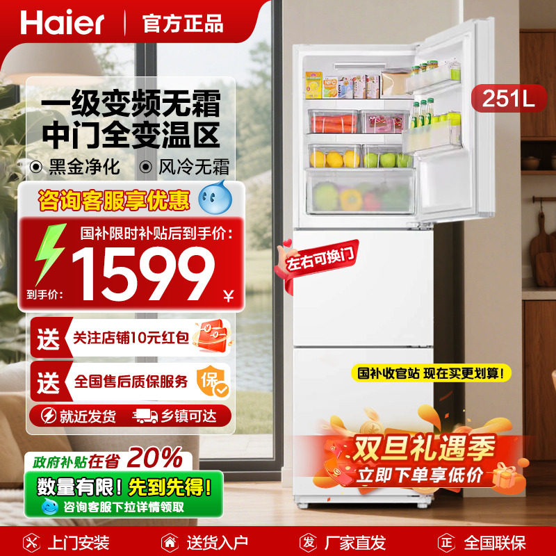 海尔电冰箱三门219L升软冷冻直冷微霜家用小型节能多门官方旗舰店