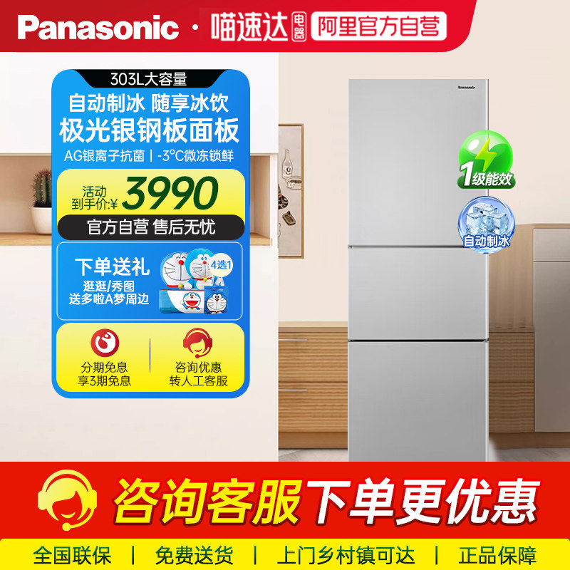 国补20% 2025新品松下冰箱三门303L一级能效自动制冰NR-30CAGEC-S