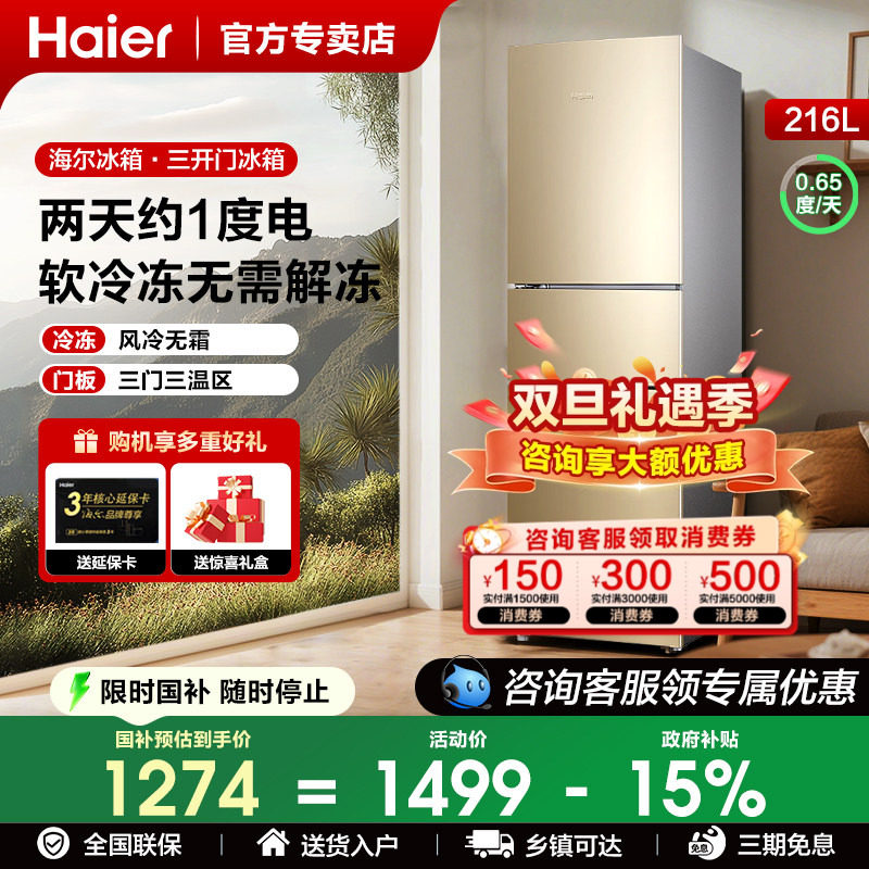 【政府换新补贴】海尔218L家用电冰箱三门软冷冻小型节能风冷官旗