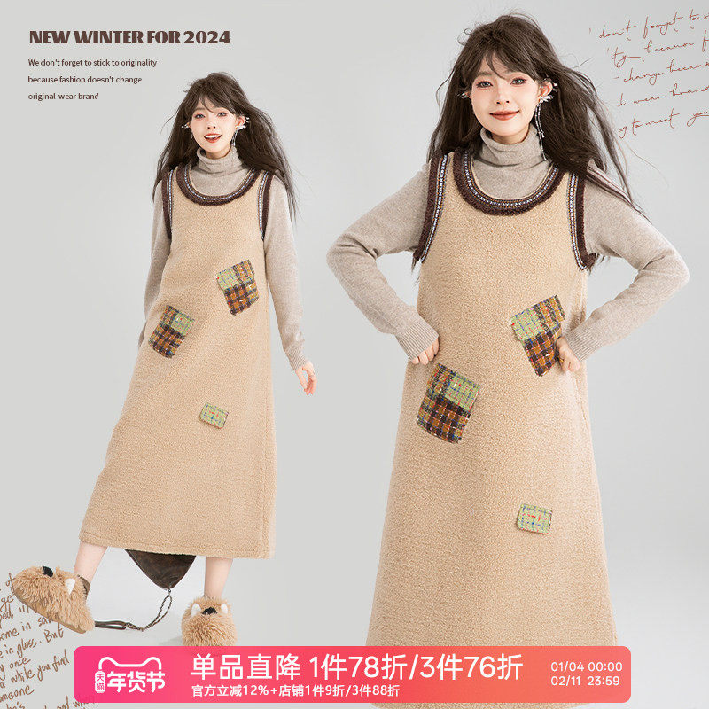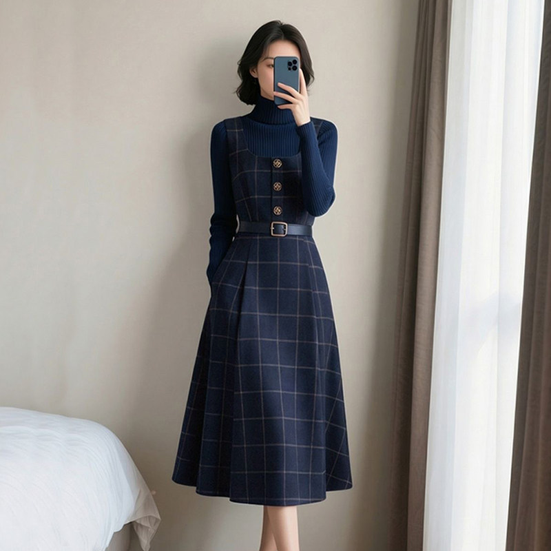 复古女秋冬新款高领毛衣格纹毛呢背心裙两件套收腰气质洋气连衣裙