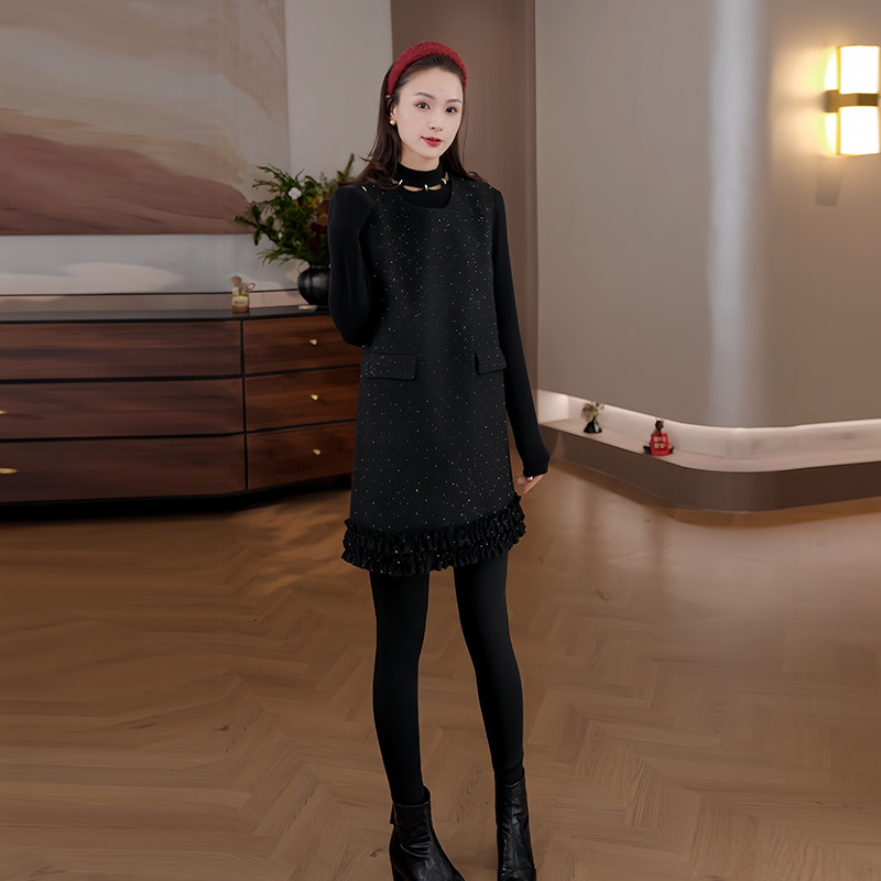 小香风毛呢背心裙亮片圆领荷叶摆A字显瘦连衣裙 2025秋冬新款女装