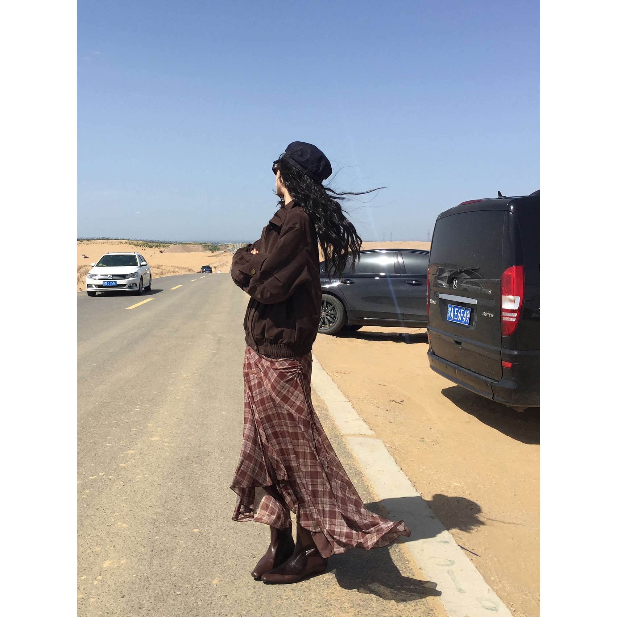 秋季新款复古格纹网纱不规则半身裙显瘦垂感层次中长款A字长裙女