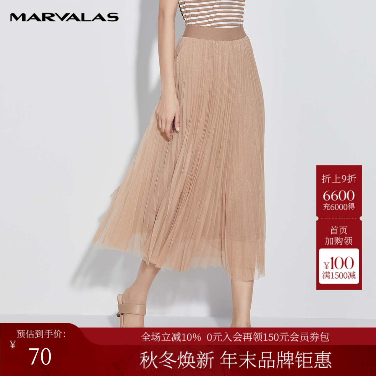 曼德诗网纱半身裙2025夏季高腰飘逸百褶裙自然腰百搭a字裙中长裙