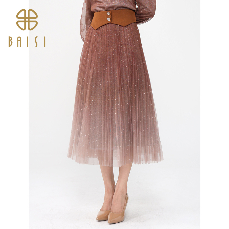 珂莱蒂尔2025春季新款黑色渐变闪亮网纱中长裙女优雅气质半身裙女