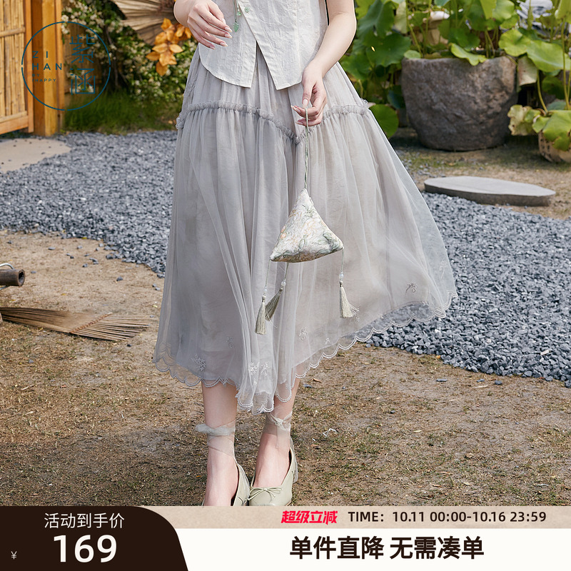 紫涵水墨风网纱半身裙女秋季新款休闲轻国风牛筋高腰刺绣中长裙子