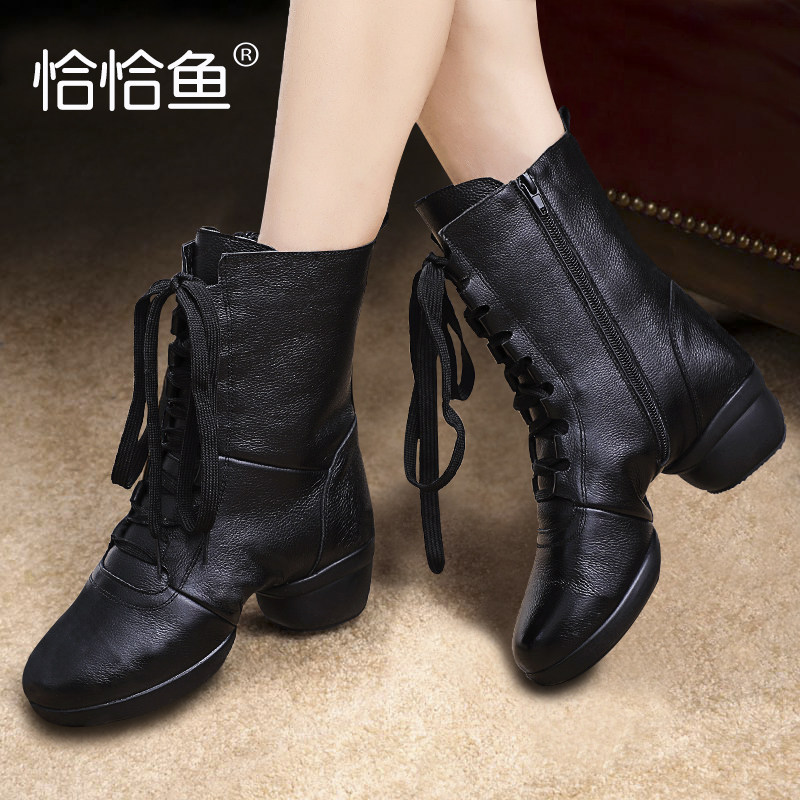 恰恰鱼秋冬季真皮广场舞鞋长筒靴子跳舞鞋女软底中跟水兵舞蹈鞋子