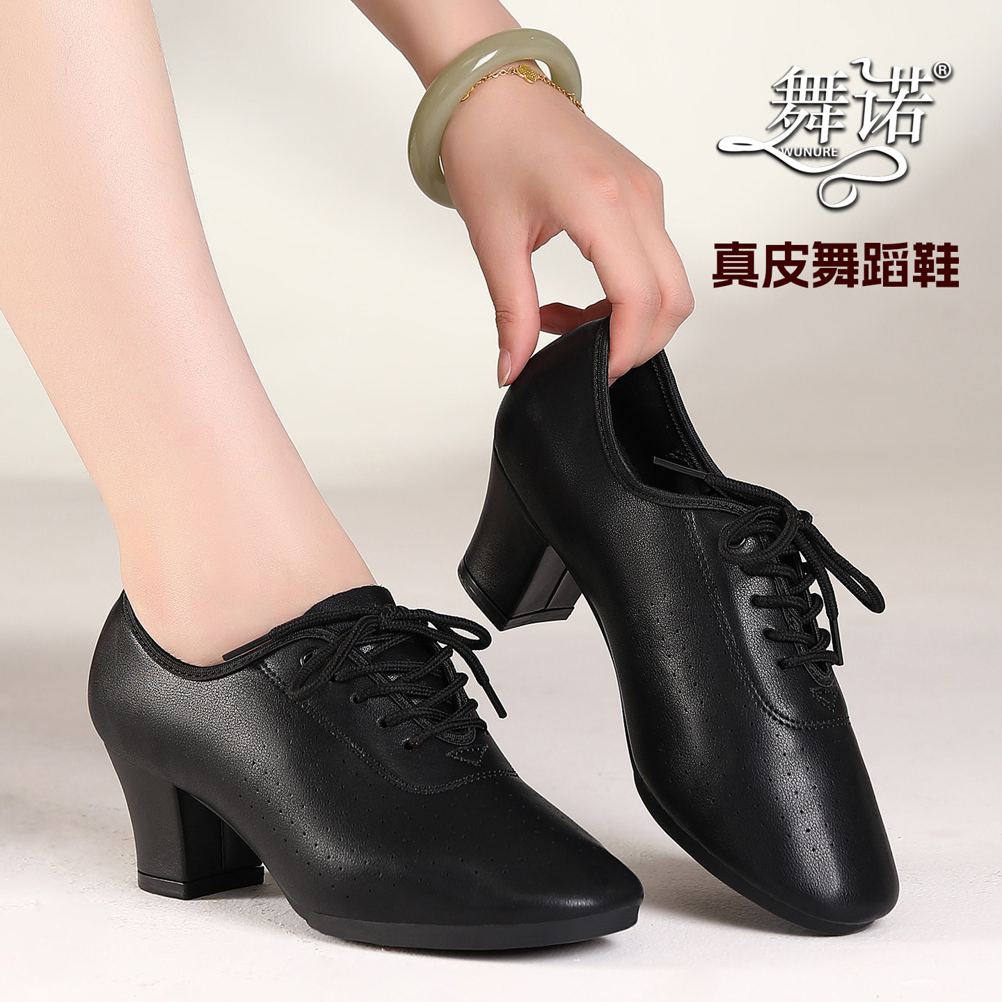 舞诺真皮广场舞鞋女士成人中跟软底形体训练教师鞋交谊水兵舞蹈鞋