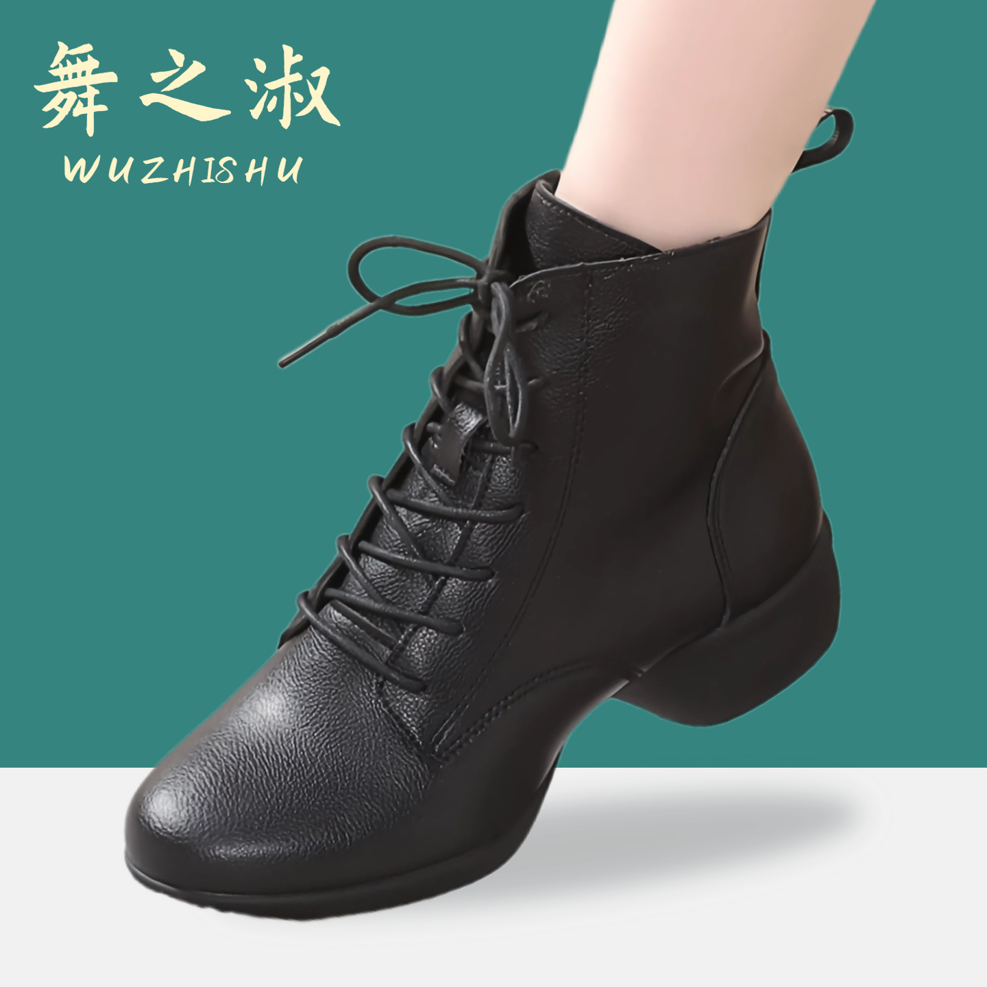 阅舞广场舞蹈鞋女真皮软底系带中筒靴粗跟女士水兵舞蹈鞋跳舞靴子
