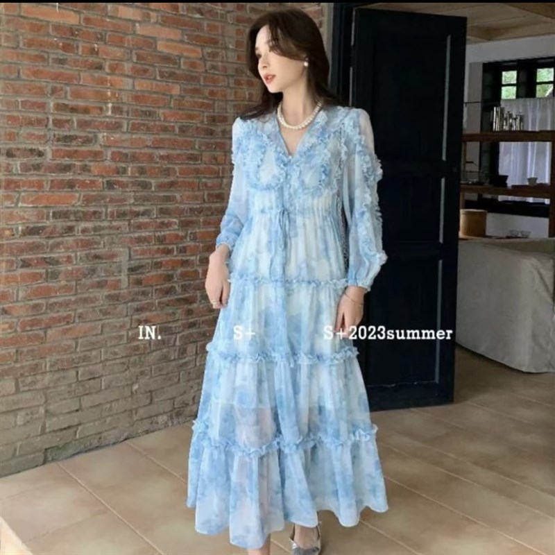 Lavinia法式v领碎花连衣裙女春秋新款温柔风百搭气质打底雪纺长裙