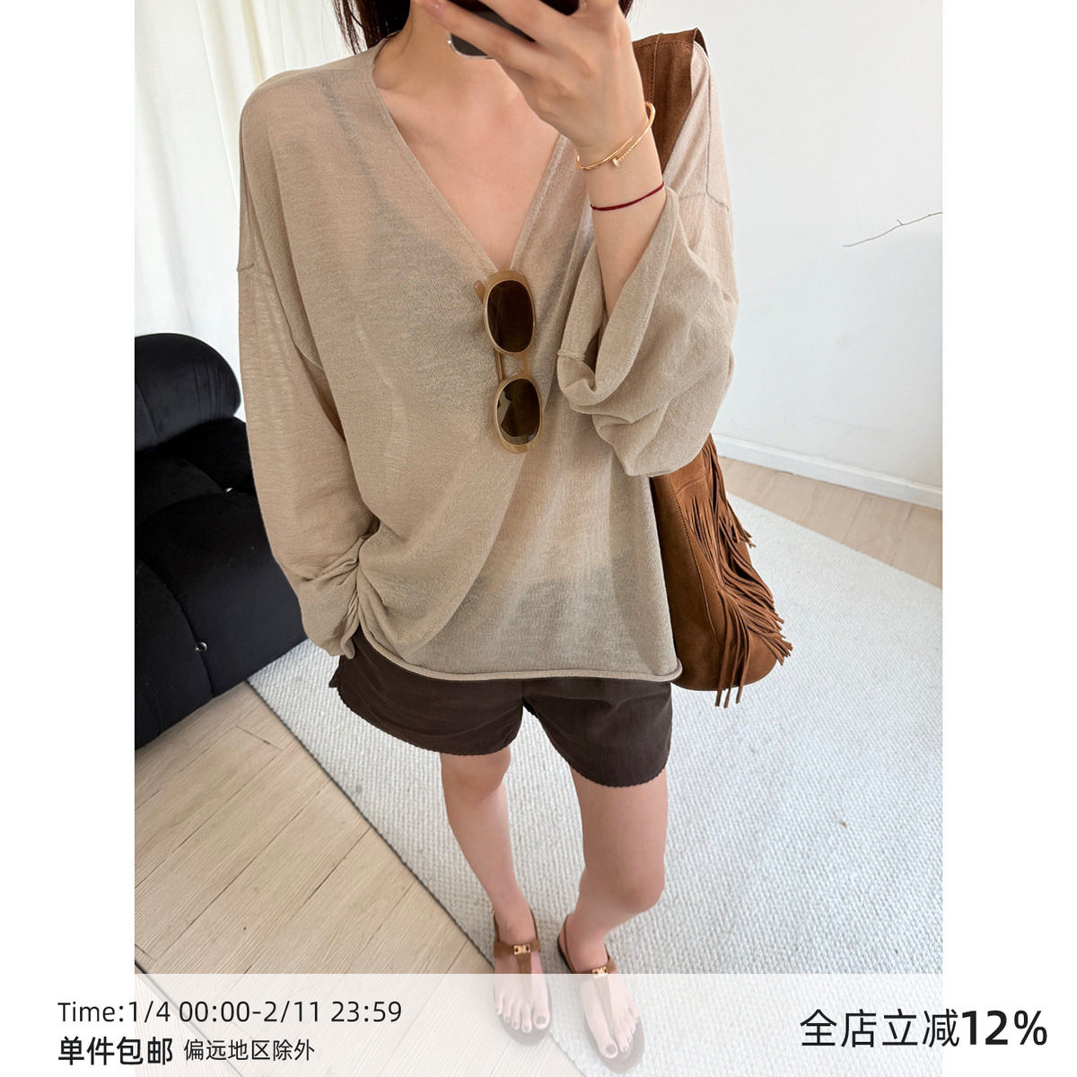 【4/29 20:00】MUCCHIC/亚麻轻薄微透V领防晒针织衫