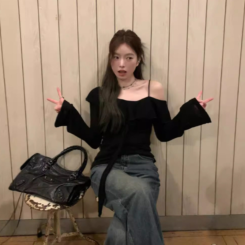 早秋黑色一字肩长袖防晒针织衫t恤女装薄款设计感露肩吊带上衣潮