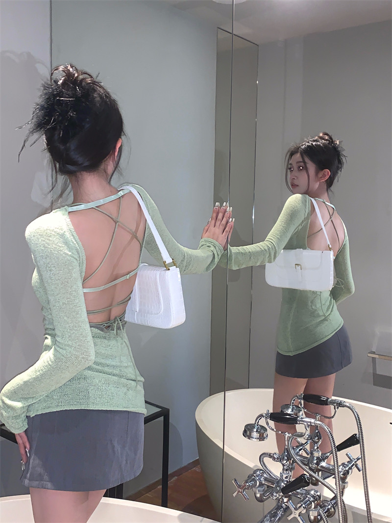 春夏纯欲薄款防晒针织衫女独特别致性感辣妹露背吊带背心美背上衣