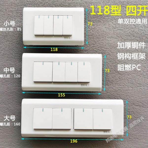 国际电工118型墙壁开关插座电灯四位四开单控开关面板四联长方形