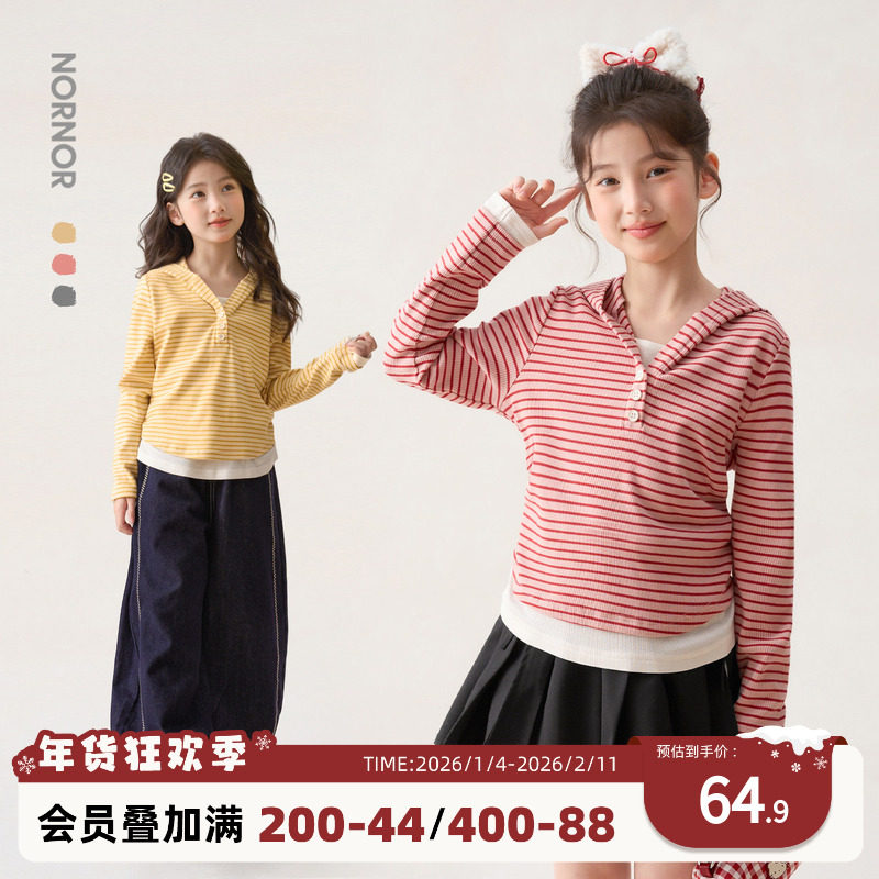 NORNOR陈大猪童装女童条纹长袖t恤假两件连帽修身儿童春装上衣女