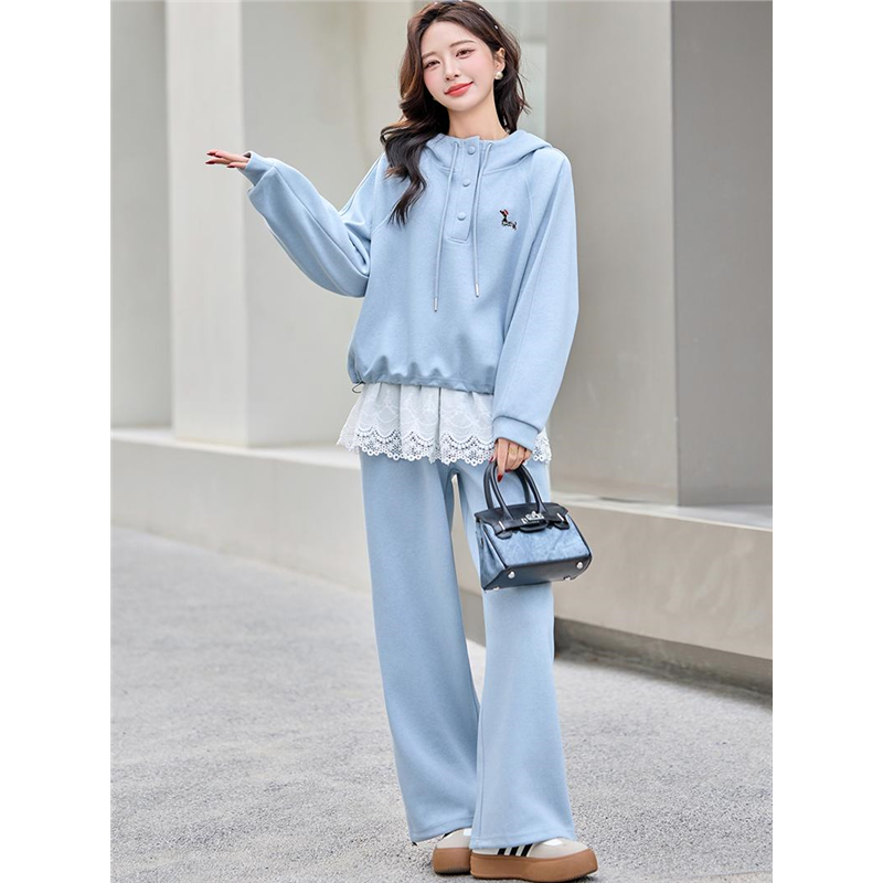 休闲运动套装女2025春装新款韩版时尚蕾丝拼接洋气宽松显瘦两件套