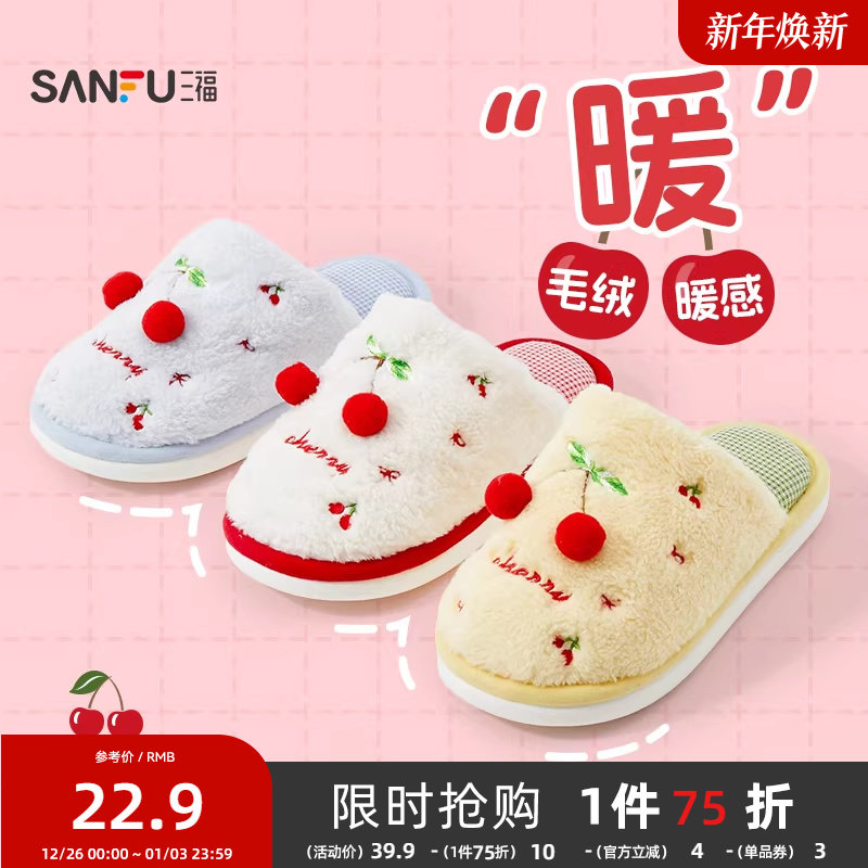 三福棉拖鞋樱桃可爱厚底室内家居毛绒保暖包头半拖鞋女冬2025新款