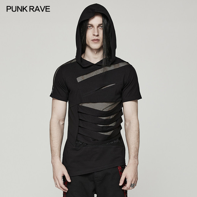 PUNKRAVE男士暗黑系连帽短袖T恤哥特风摇滚时尚潮流拼接镂空上衣