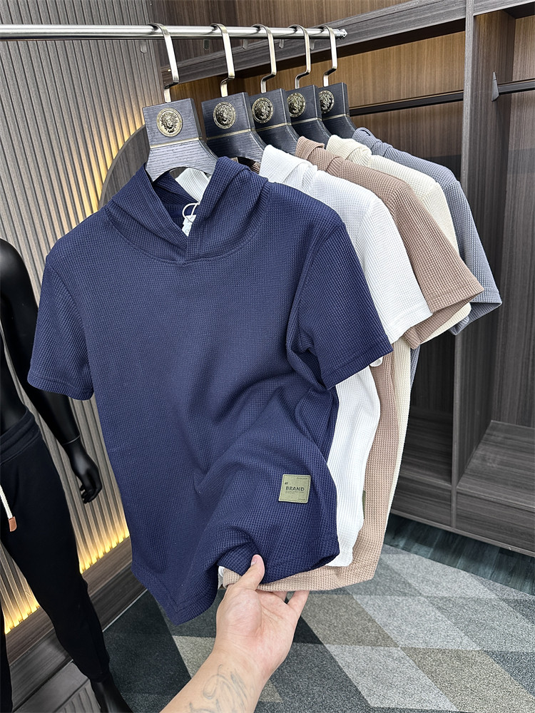 连帽版本!麂皮绒小标~柜300+!夏季男士纯色连帽套头短袖T恤衫潮