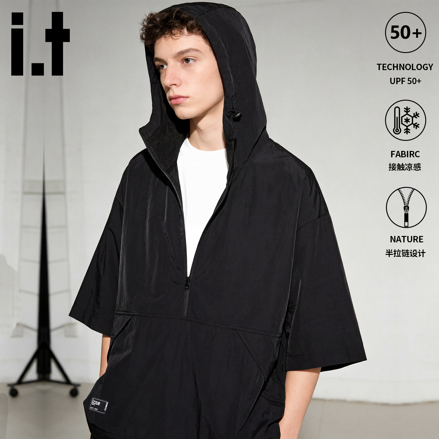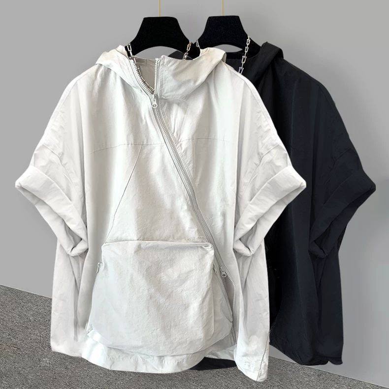 拉链连帽短袖t恤男夏季宽松工装口袋设计感冰丝速干防晒半袖体恤