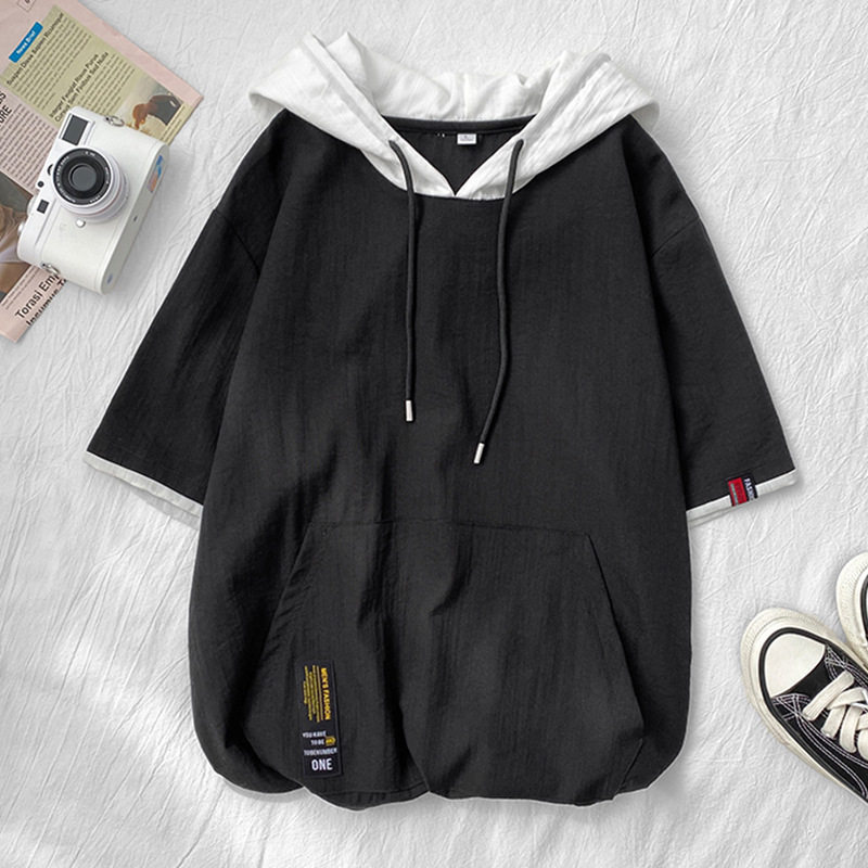 潮牌夏季亚麻连帽短袖男潮流宽松大码日系撞色t恤ins五分袖带帽衫