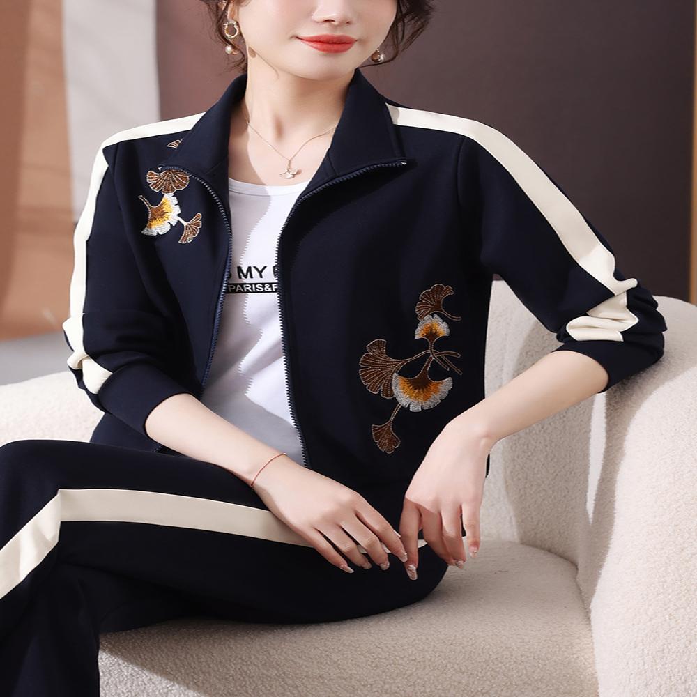 啄木鸟运动服套装女款春秋2024新款立领时尚显瘦妈妈装休闲三件套