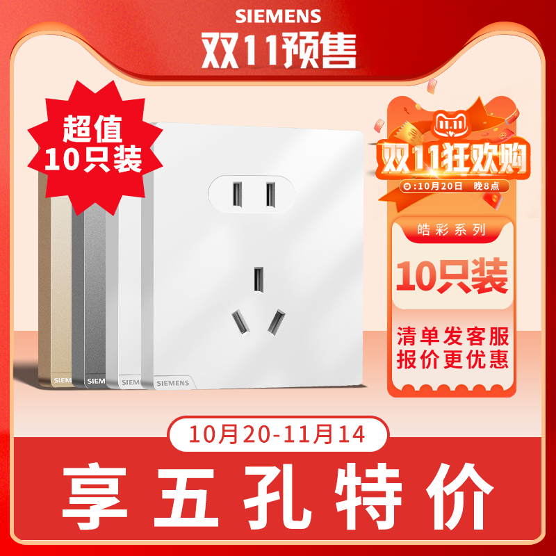 【5只装送1到手6只】西门子皓彩斜五孔插座套餐86型面板预售活动