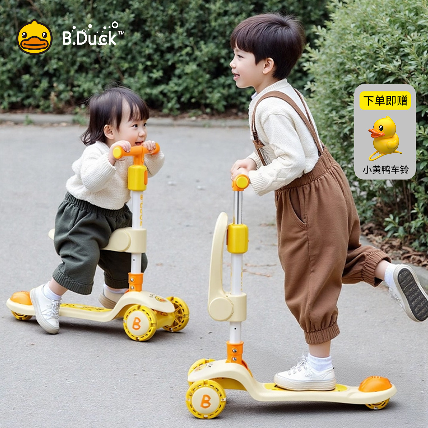 B.Duck小黄鸭儿童滑板车2-10岁三轮踏板车闪光轮护栏遮阳折叠童车