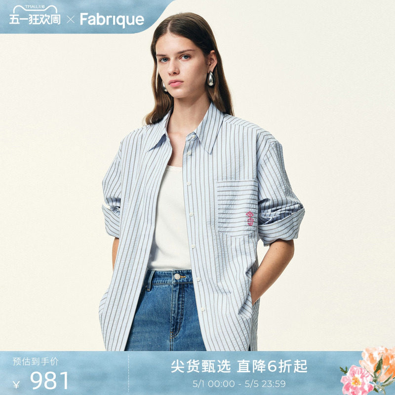 Fabrique蓝白条纹棉质刺绣宽松大廓形长袖衬衫2026年春新款上衣女
