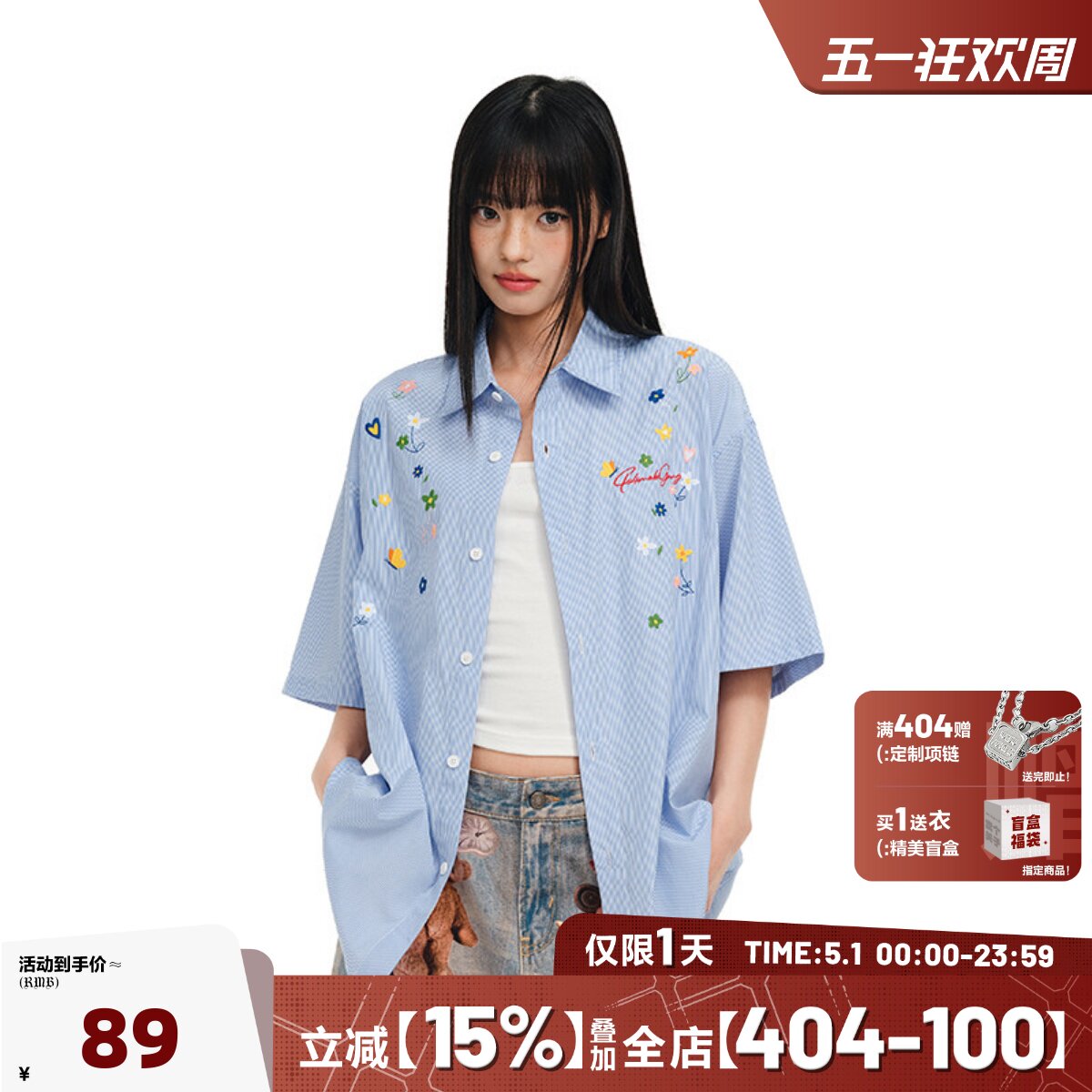 404MOB蓝色立体花卉刺绣衬衫男女夏季多巴胺情侣宽松休闲条纹上衣