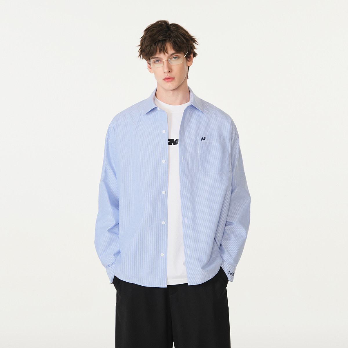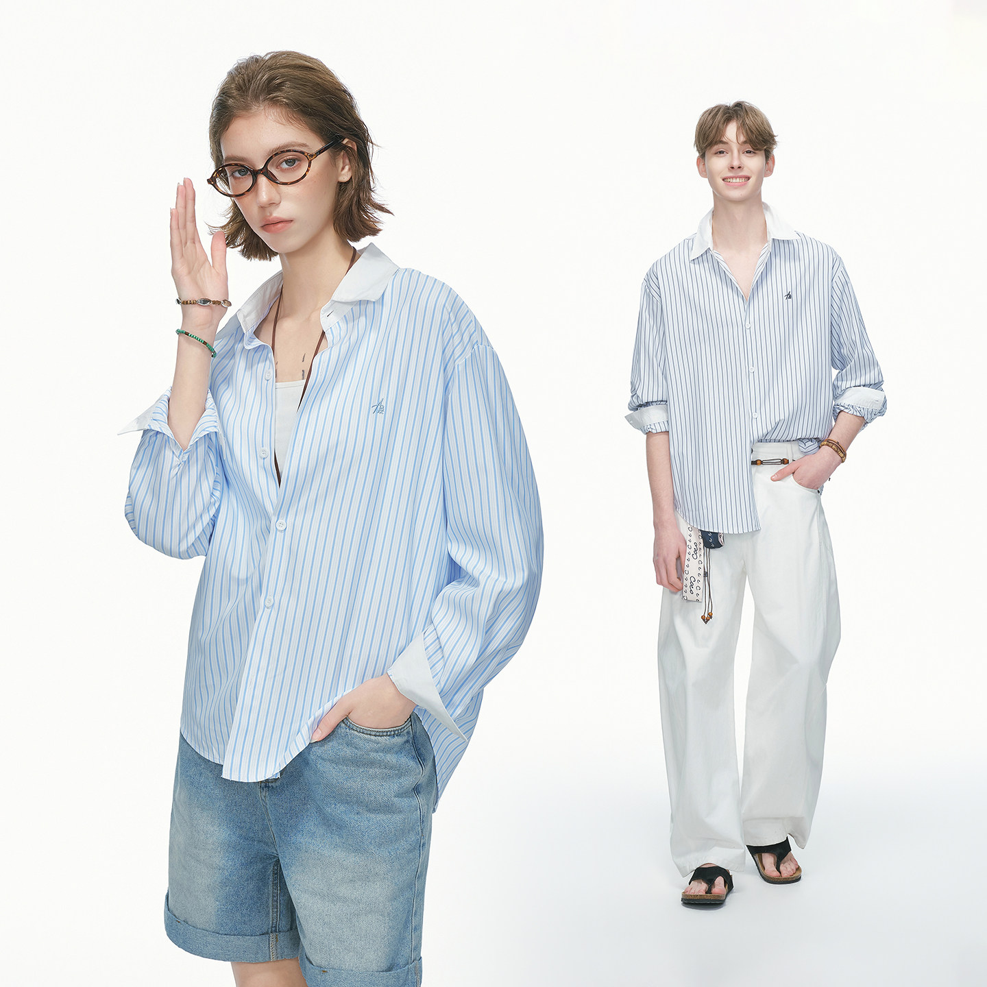 Dream made 蓝色条纹长袖衬衫男女夏季薄款休闲通勤情侣刺绣衬衣
