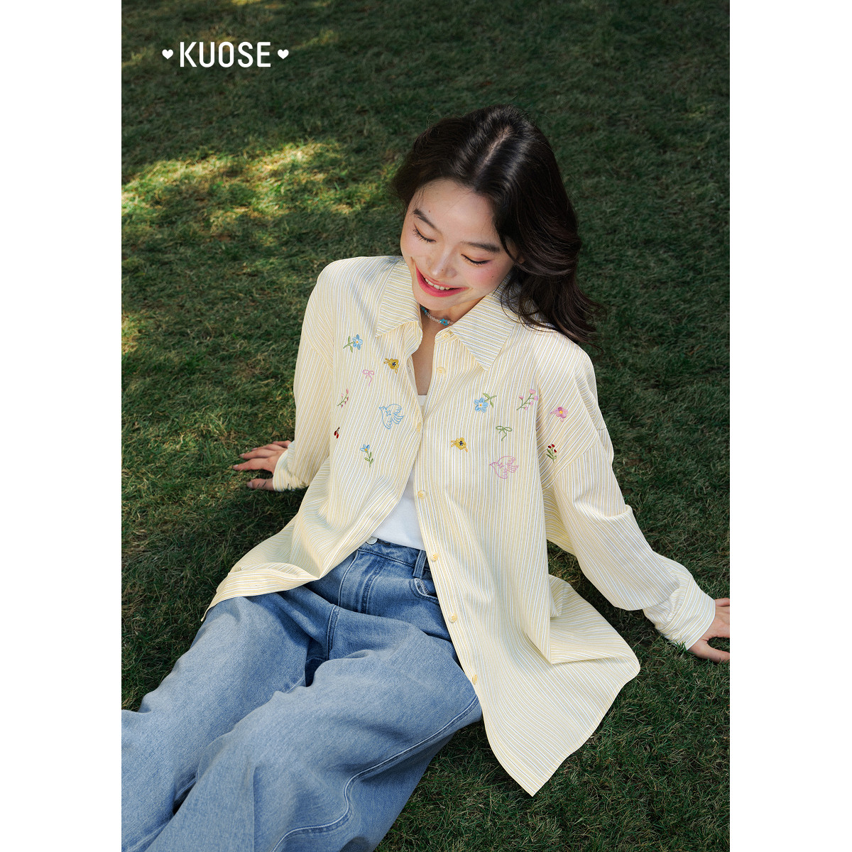 阔色浅黄色刺绣衬衫外套条纹衬衣26春夏季新款女长袖翻领休闲上衣