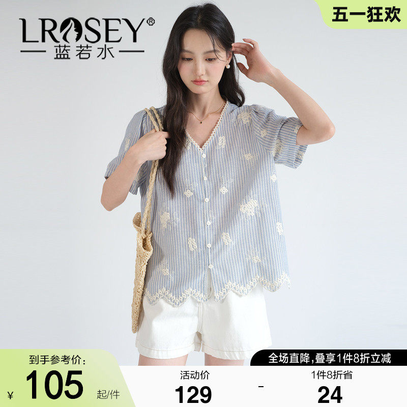 蓝若水大码女装胖MM温柔风条纹衬衫2026夏装新款蕾丝V领刺绣上衣