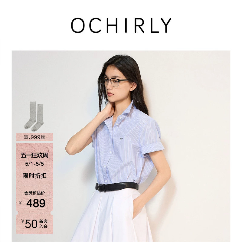 OCHIRLY欧时力 字母刺绣条纹短袖衬衫女上衣通勤宽松夏新