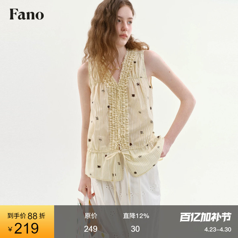范洛Fano 撞色蝴蝶刺绣衬衫女2026夏新款条纹木耳边抽绳无袖背心