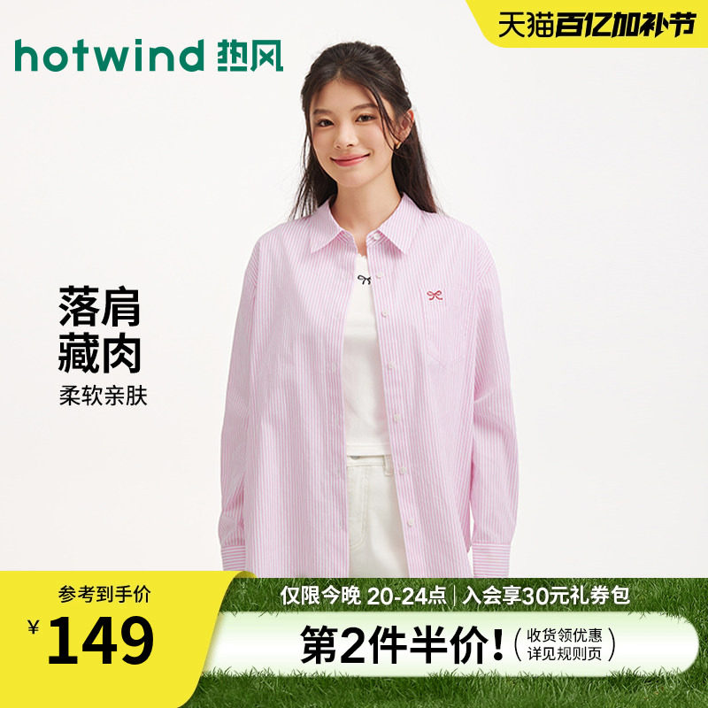 热风女士长袖衬衫上衣内搭2026年春季新款刺绣条纹衬衫通勤风衬衣